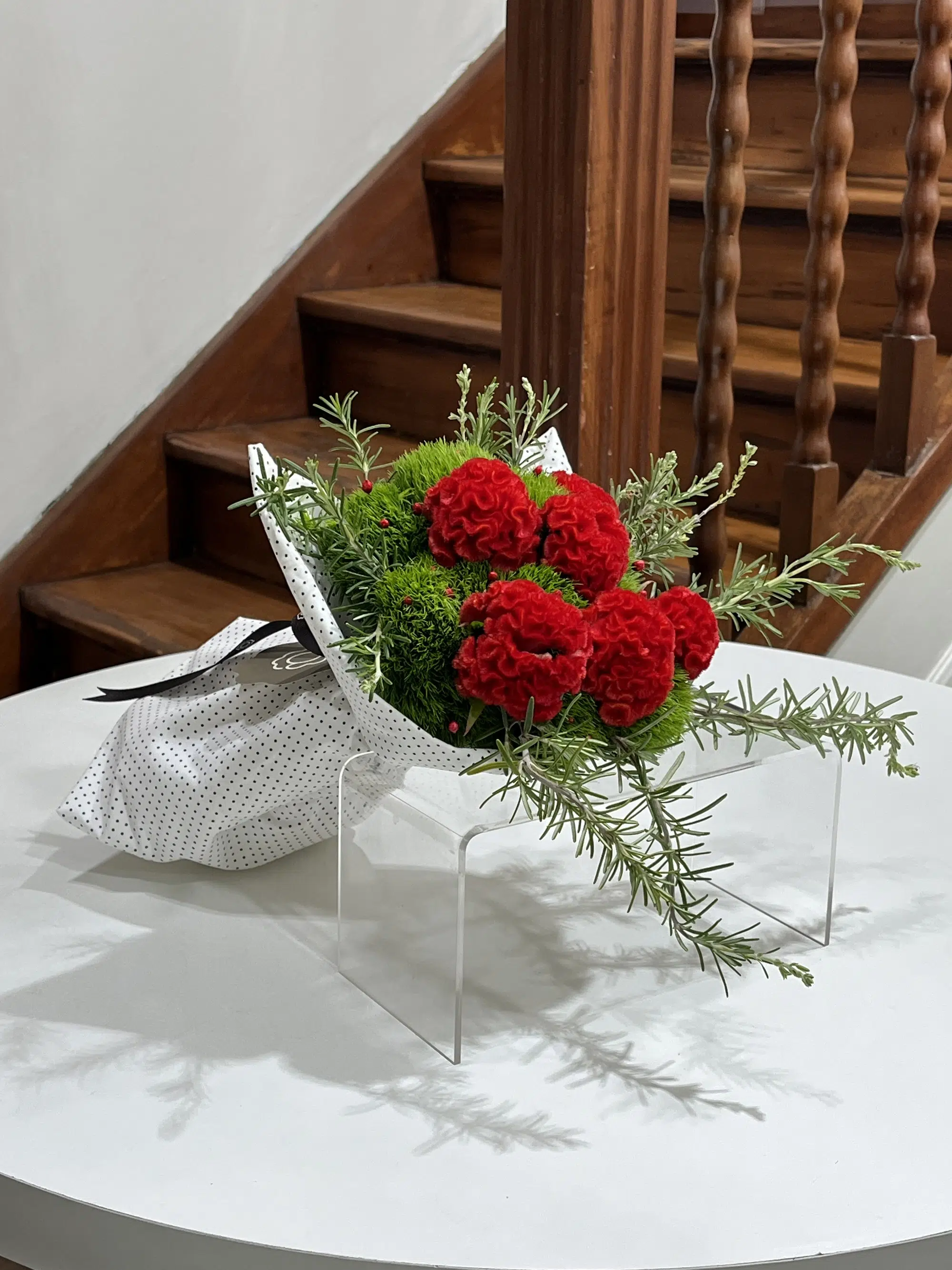 Buquê de Celosias envolto em tecido de algodão cru e fita de cetim.