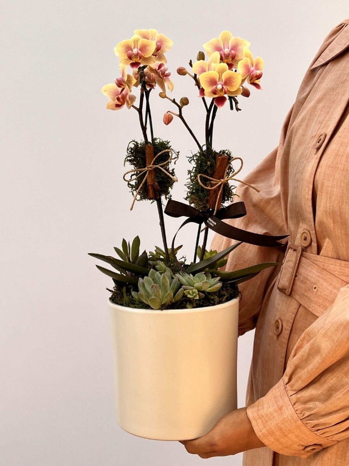 Suas pétalas em amarelo dourado com toques rosados lembram o céu aquecido de fim de tarde, enquanto a base ganha vida com suculentas que abraçam a raiz da orquídea, criando um contraste harmonioso entre elegância e natureza bruta.