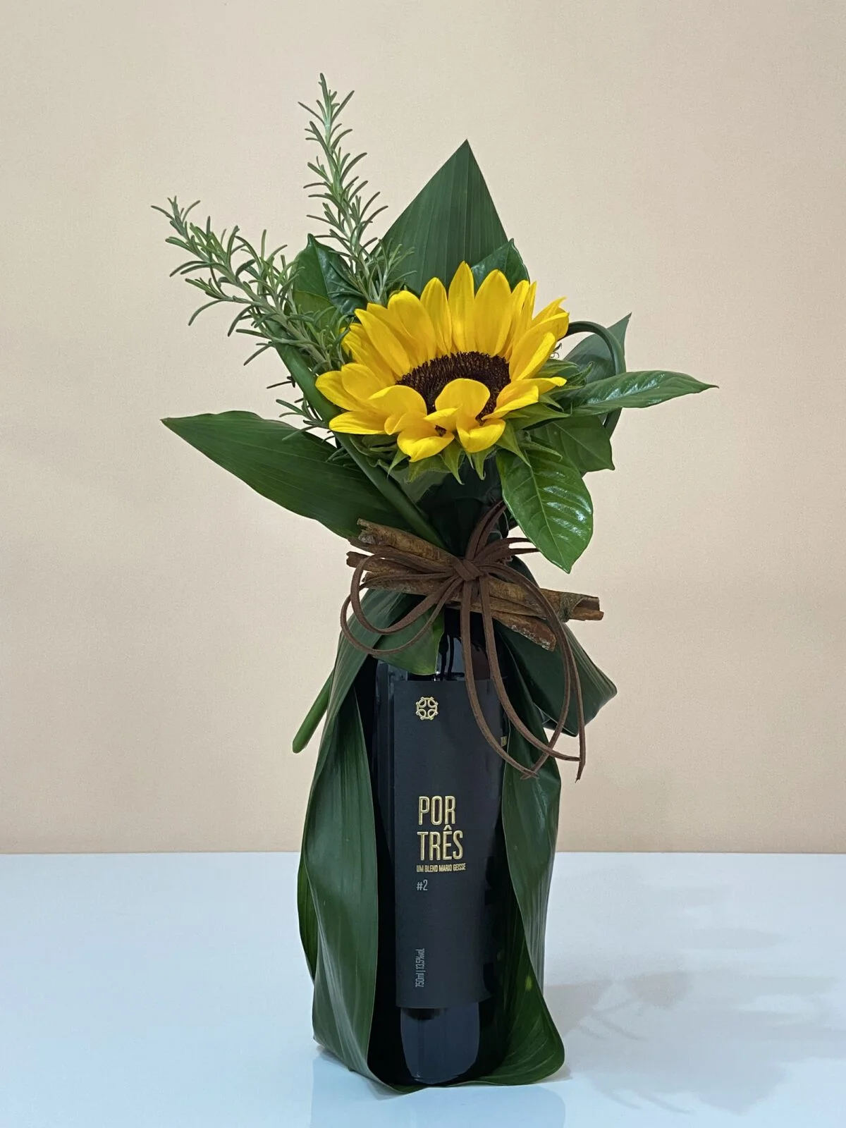 Por Três, um blend de Mario Geisse, adornado com Girassol, folhas de Alecrins e Gardênias.