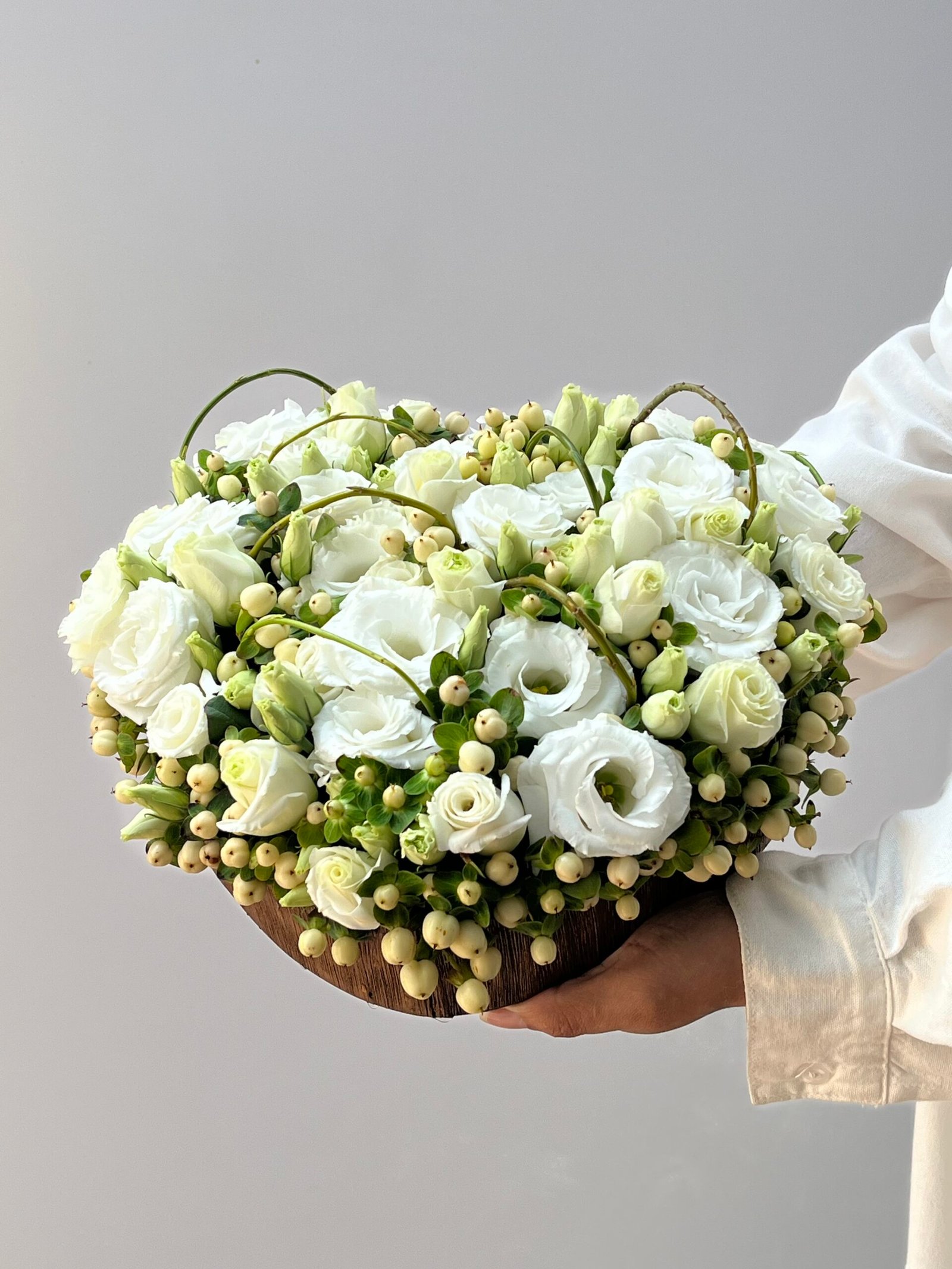Arranjo de Lisianthus brancos e Hypericums em caixa de madeira rústica com formato de coração.