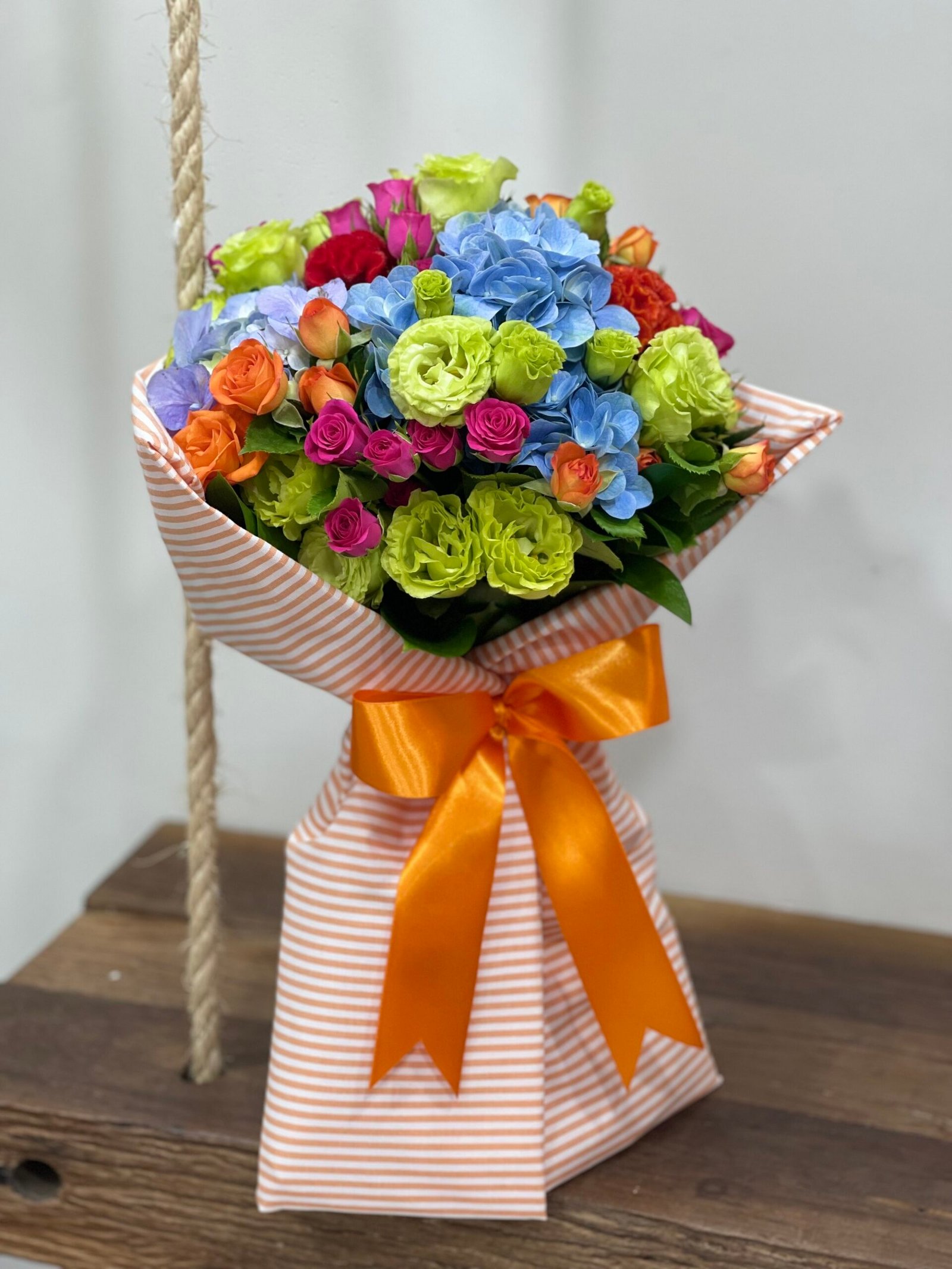 Buquê de hortênsias, lisianthus, mini rosas, e celósias, envolto em tecido de algodão listrado, e finalizado com laço de cetim laranja.