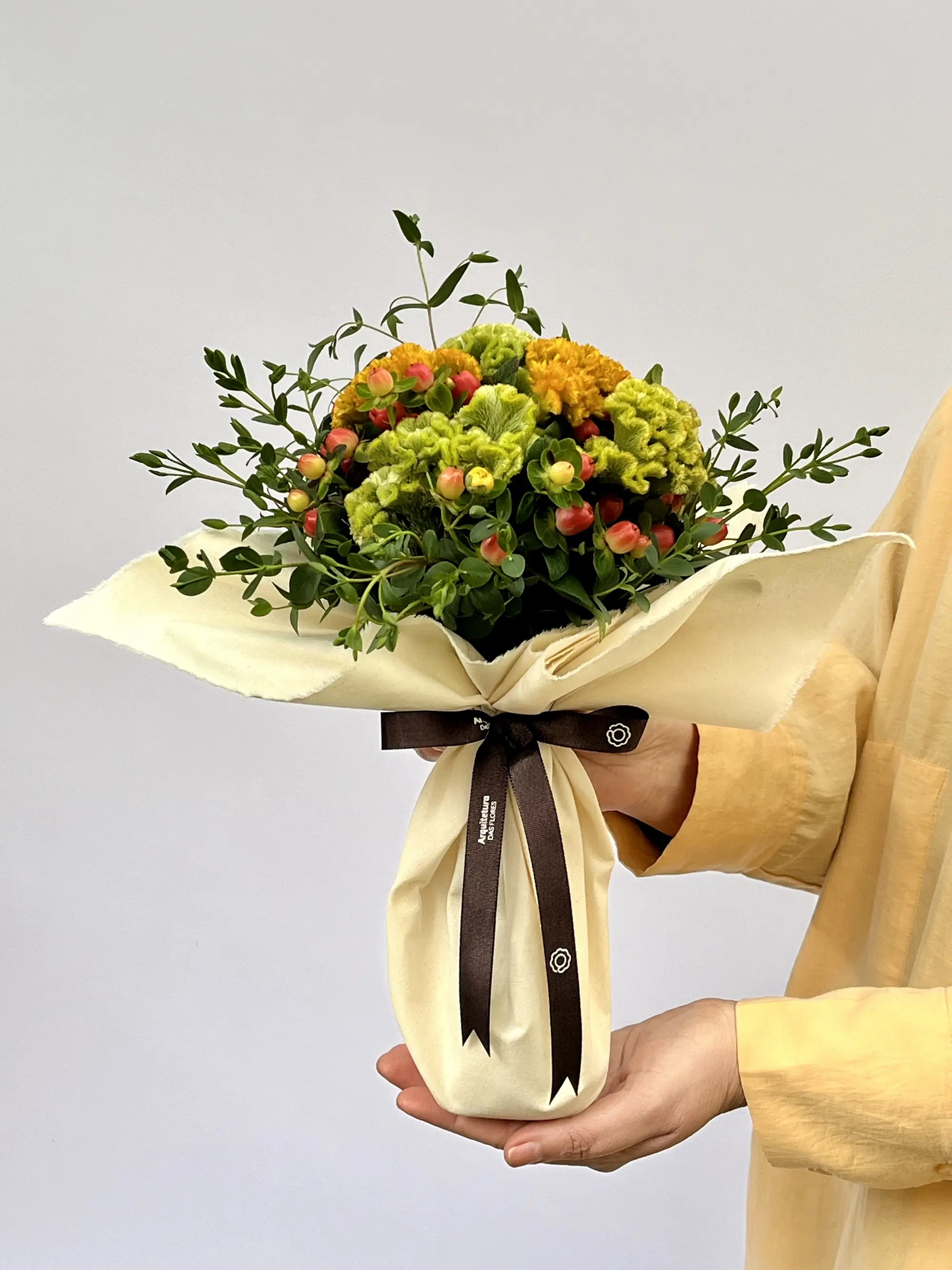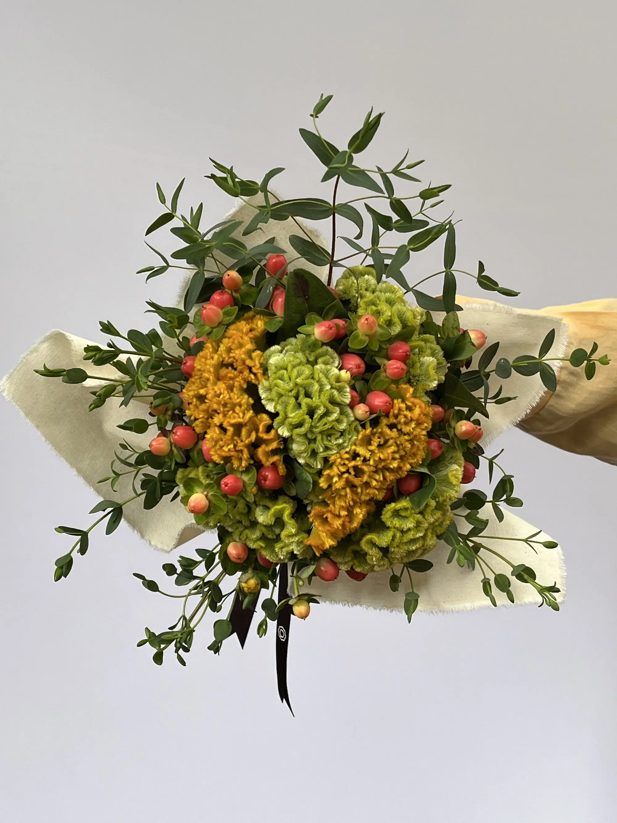 Celósias, Eucaliptos, Hypericos, tecido de algodão e fita de cetim.