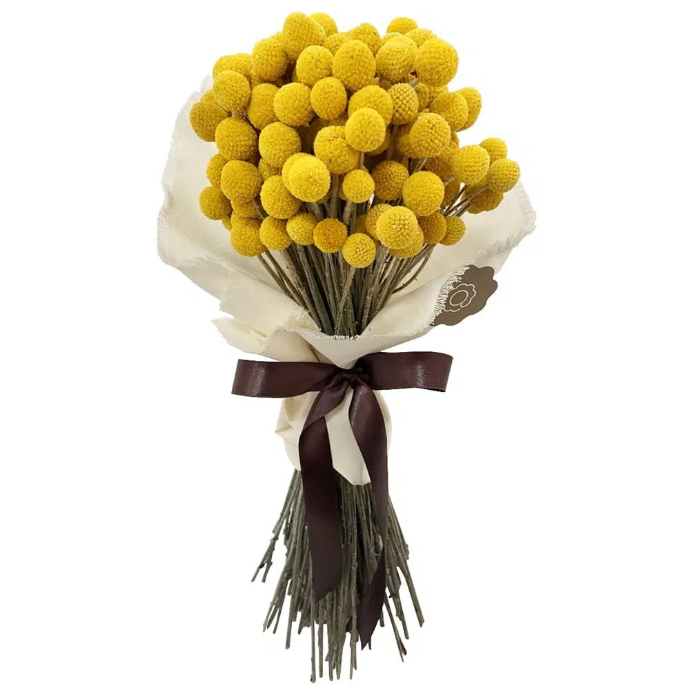 Craspédias amarelas, tecido de algodão e laço de gorgorão.