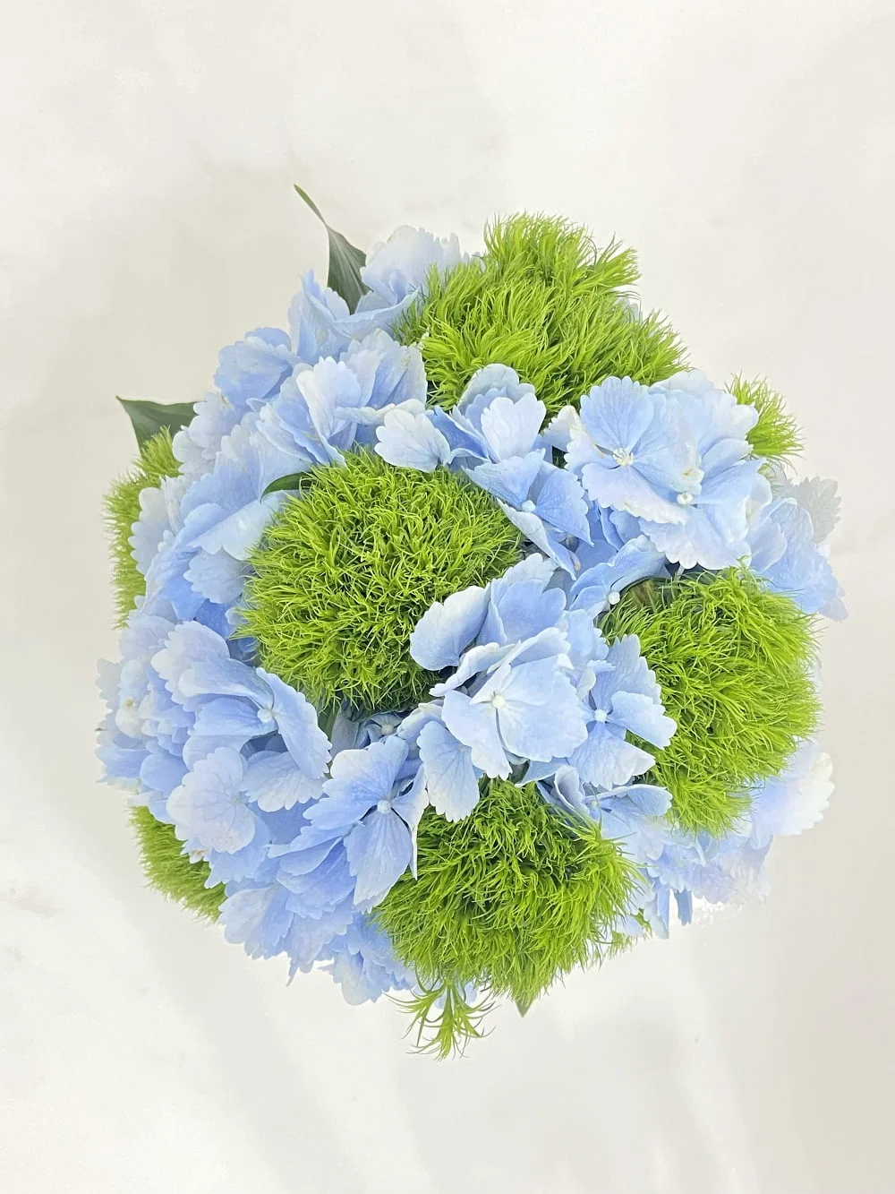 Transforme momentos simples em lembranças eternas com este requintado arranjo. Delicadas Hortênsias e vibrantes Dianthus Green Ball se unem em uma dança de cores e fragrâncias que encantarão os sentidos. Cada detalhe é cuidadosamente elaborado, desde a escolha das flores até a envolvente textura do tecido de algodão e a elegância da fita de cetim que o circunda.