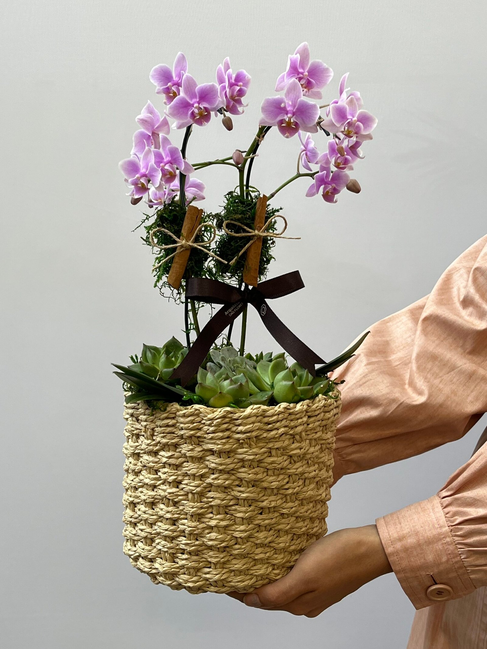 02 hastes de mini orquídeas rosas, plantadas em cesto rustíco.