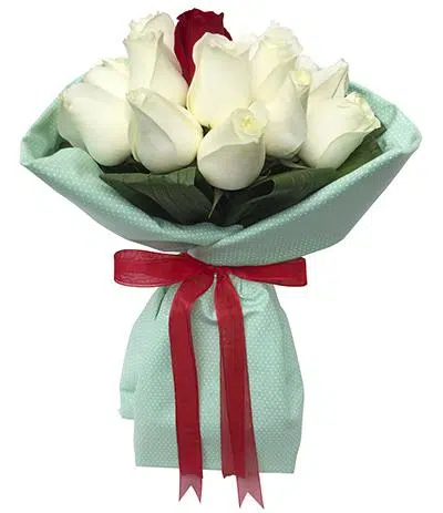 San Blass, buquê com 19 Rosas brancas e uma única vermelha ao centro em tecido e laço de fita cetim.