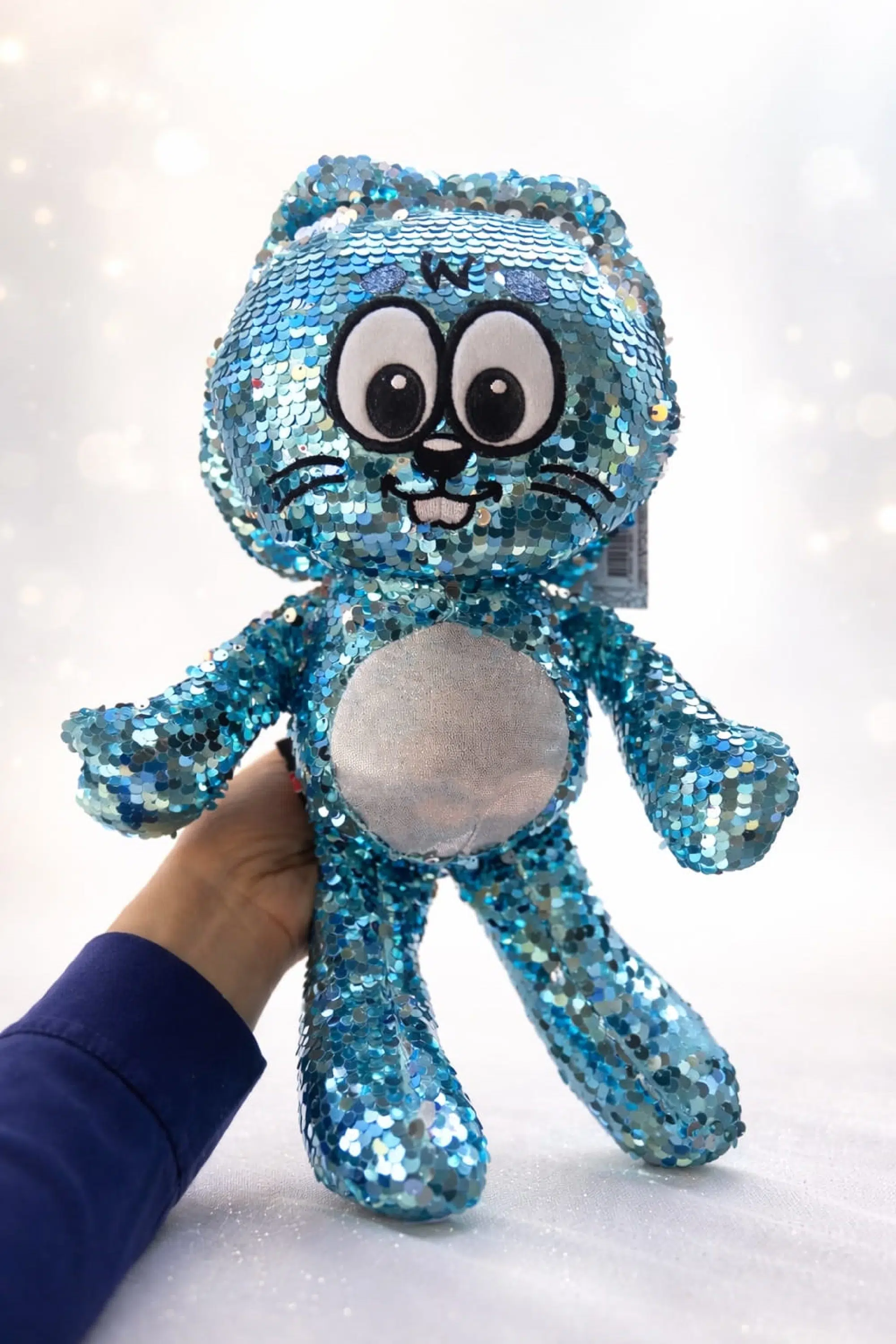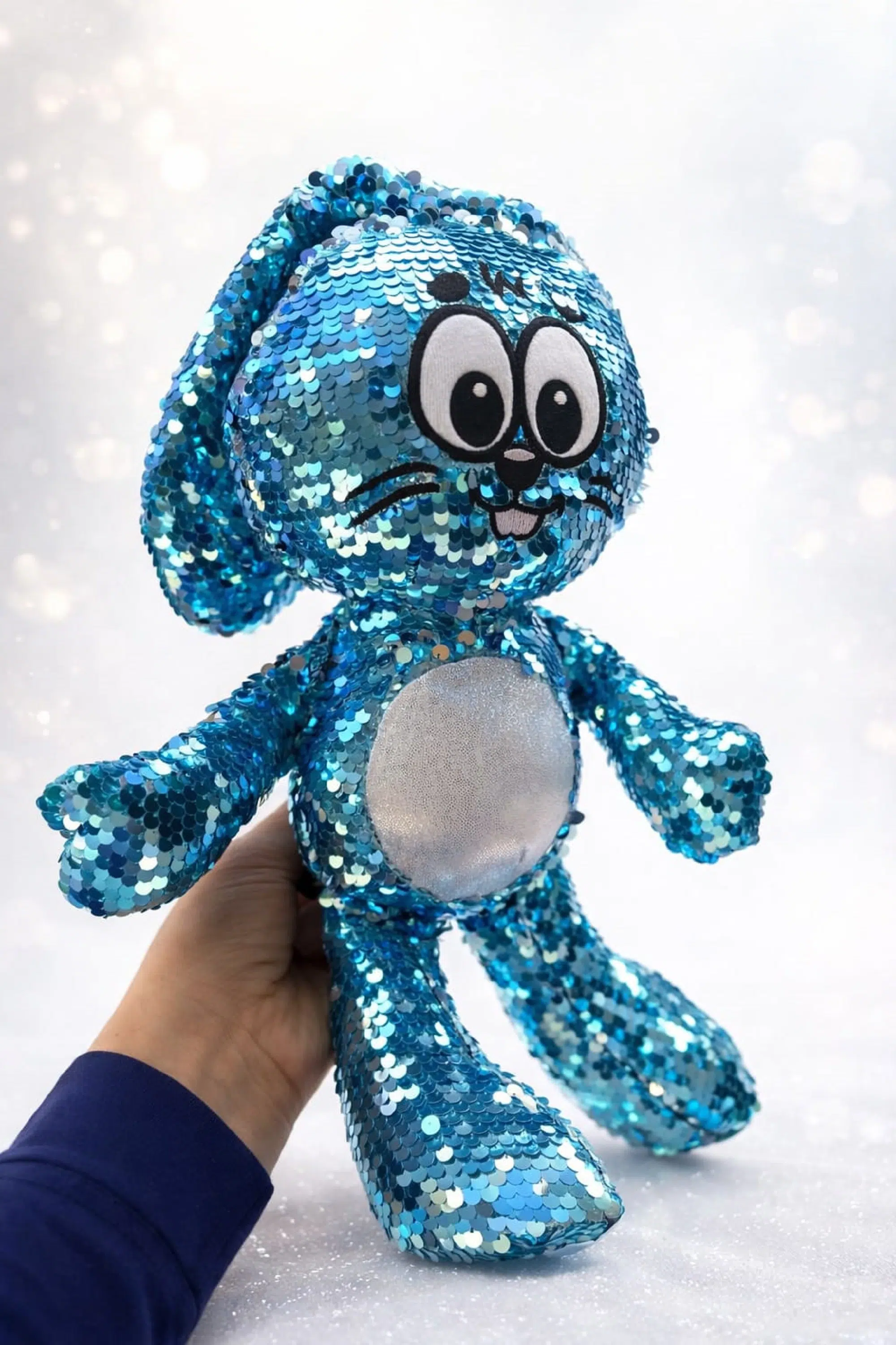 Pelúcia original Sansão, da Turma da Mônica, confeccionada com material macio e acabamento em paetê, que confere brilho e destaque à peça.
