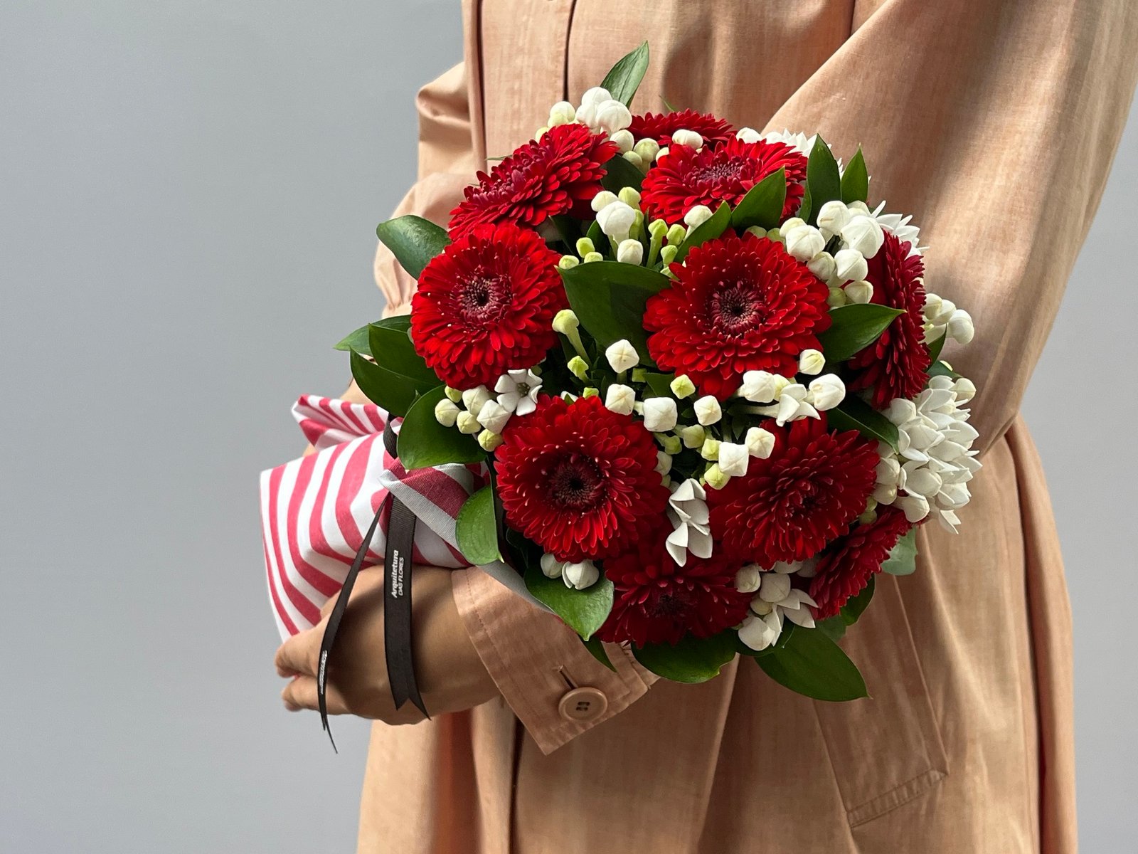 Buquê de gérberas vermelhas e bouvardias brancas, envolto em tecido de algodão listrado e laço de gorgorão marrom.