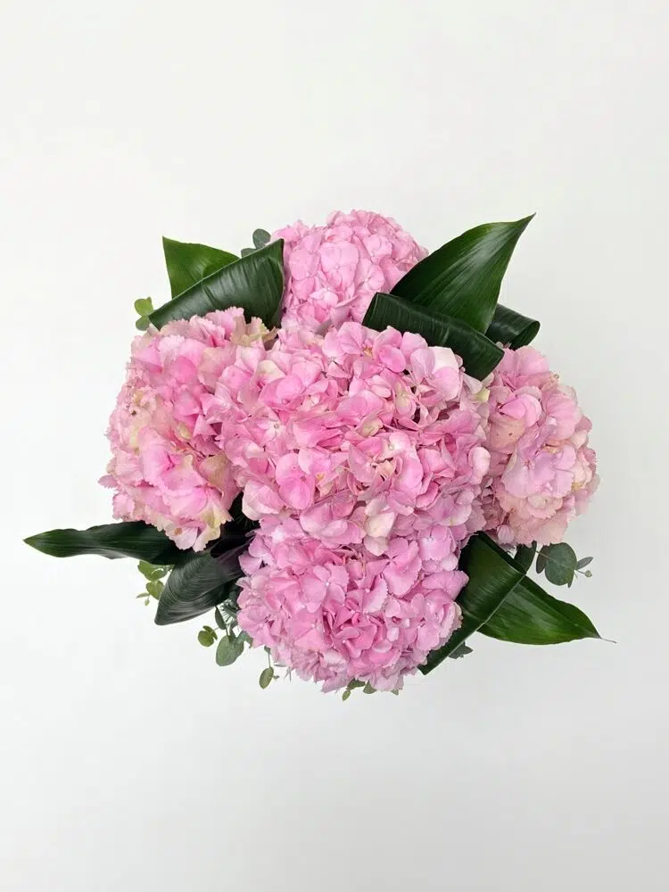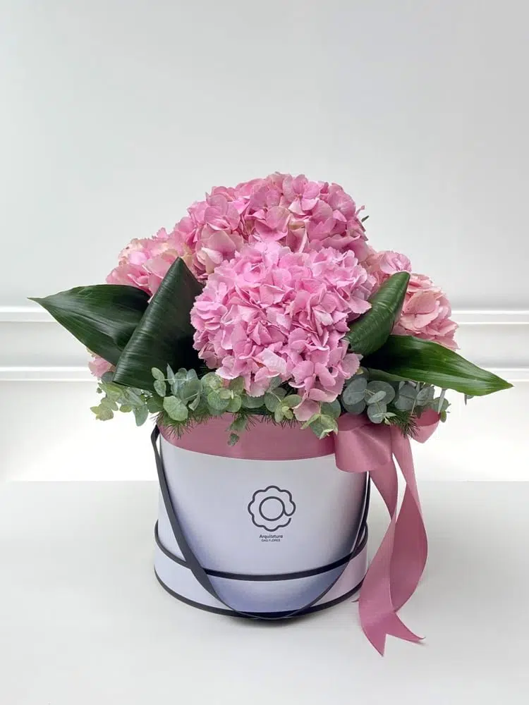 Box, hortênsia, eucalipto, aspidistra e fita de cetim.