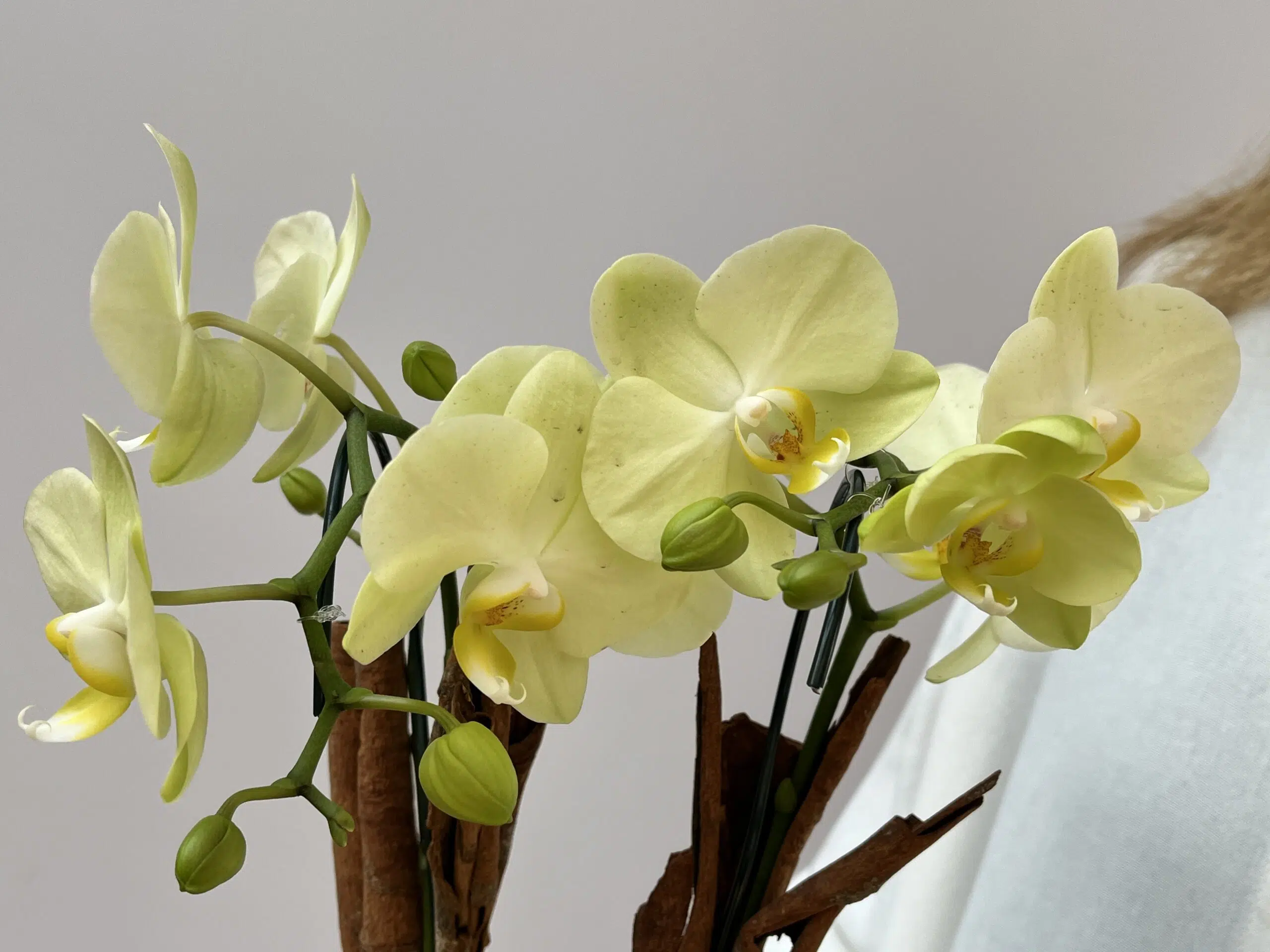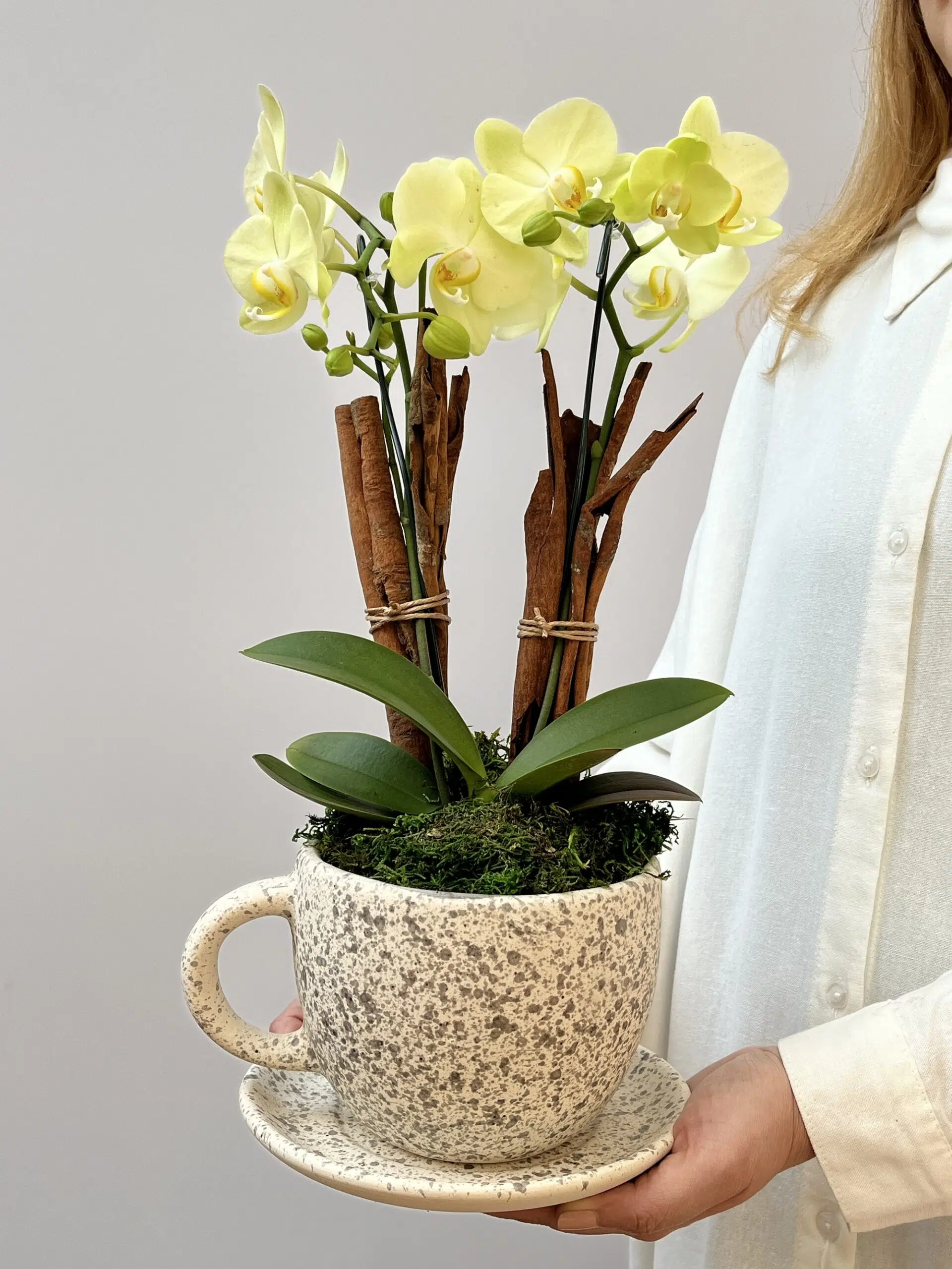 Mini Orquídea Phalaenopsis amarela com Canelas em xícara de cerâmica.