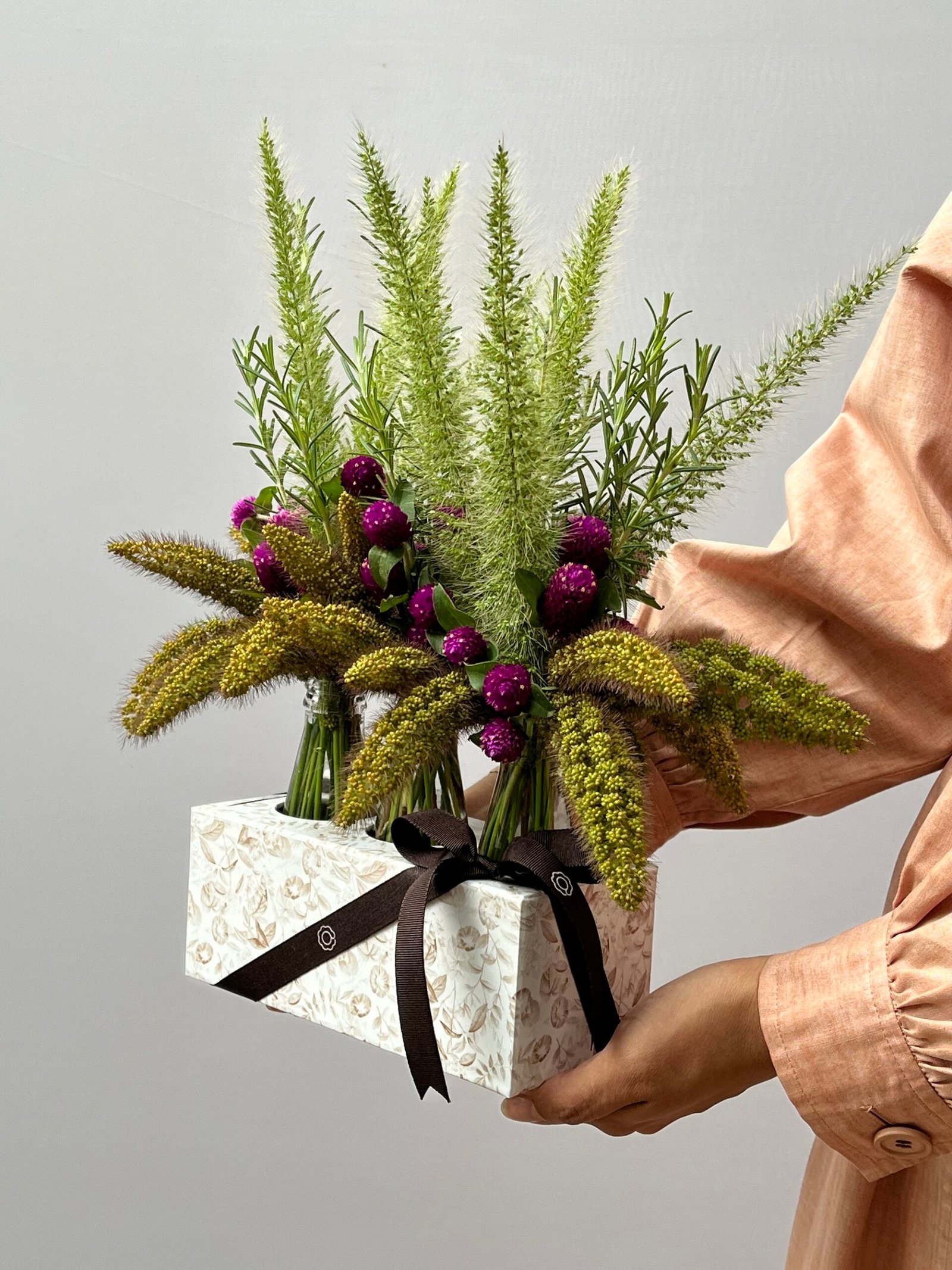 Composição botânica em box com três frascos de vidro, reunindo Flores de Perpétuas, Alecrins, Capins-do-Pampas e Trigos Aiwa.