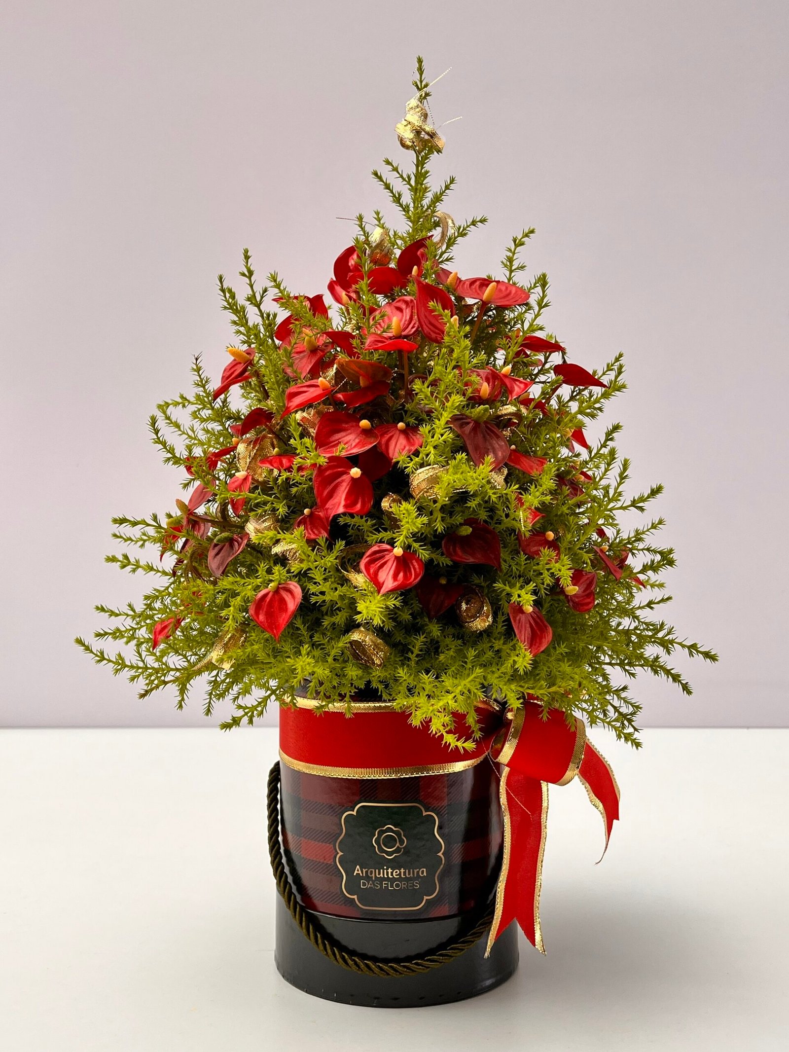 Mini Antúrios vermelhos, Tuia limão e fitas onduladas douradas.