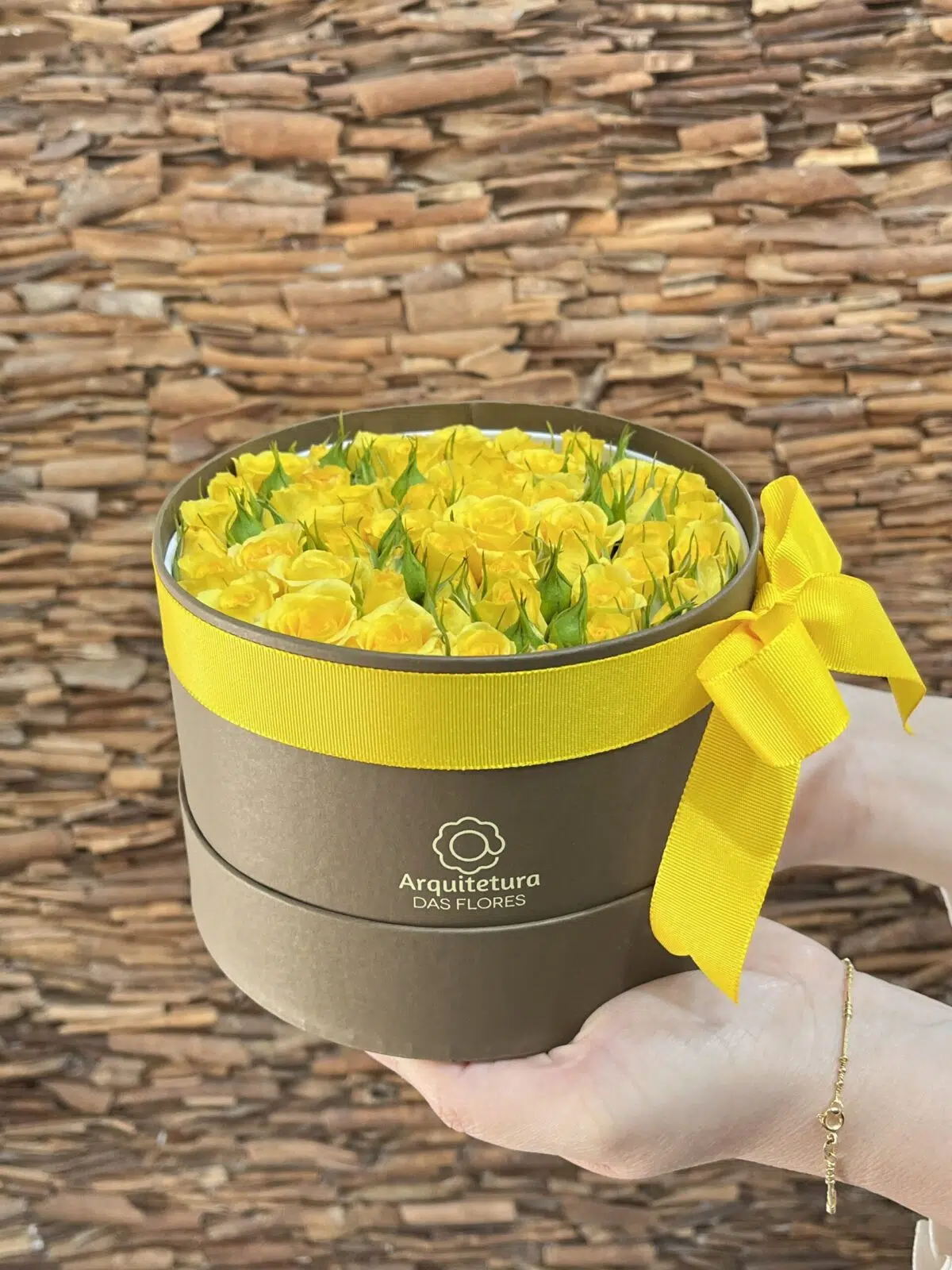 Box de Mini Rosas amarelas e fita de cetim.