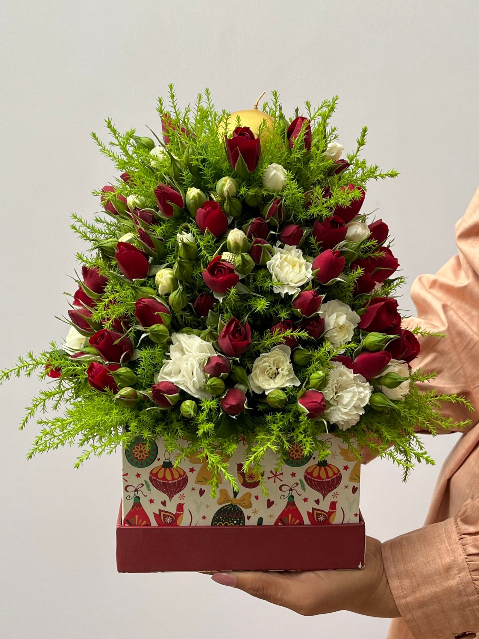 Arranjo Natalino em formato de Pinheiro, confecionado com Mini Rosas Vermelhas e Vela dourada no topo.