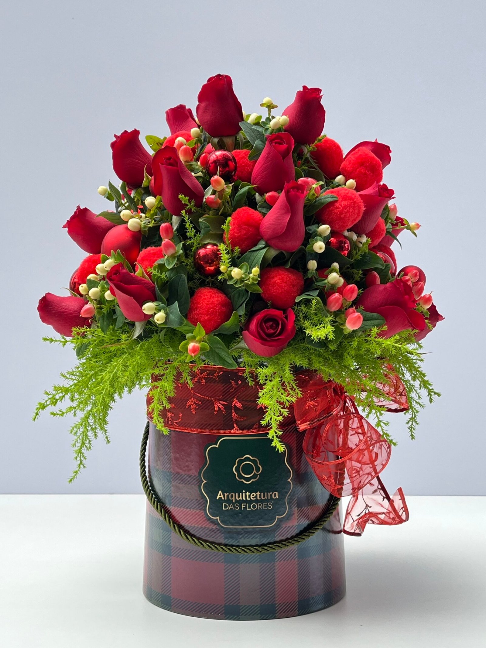 Box de Rosas vermelhas, Hypericums, folhas de pinheiros e acessórios natalinos.