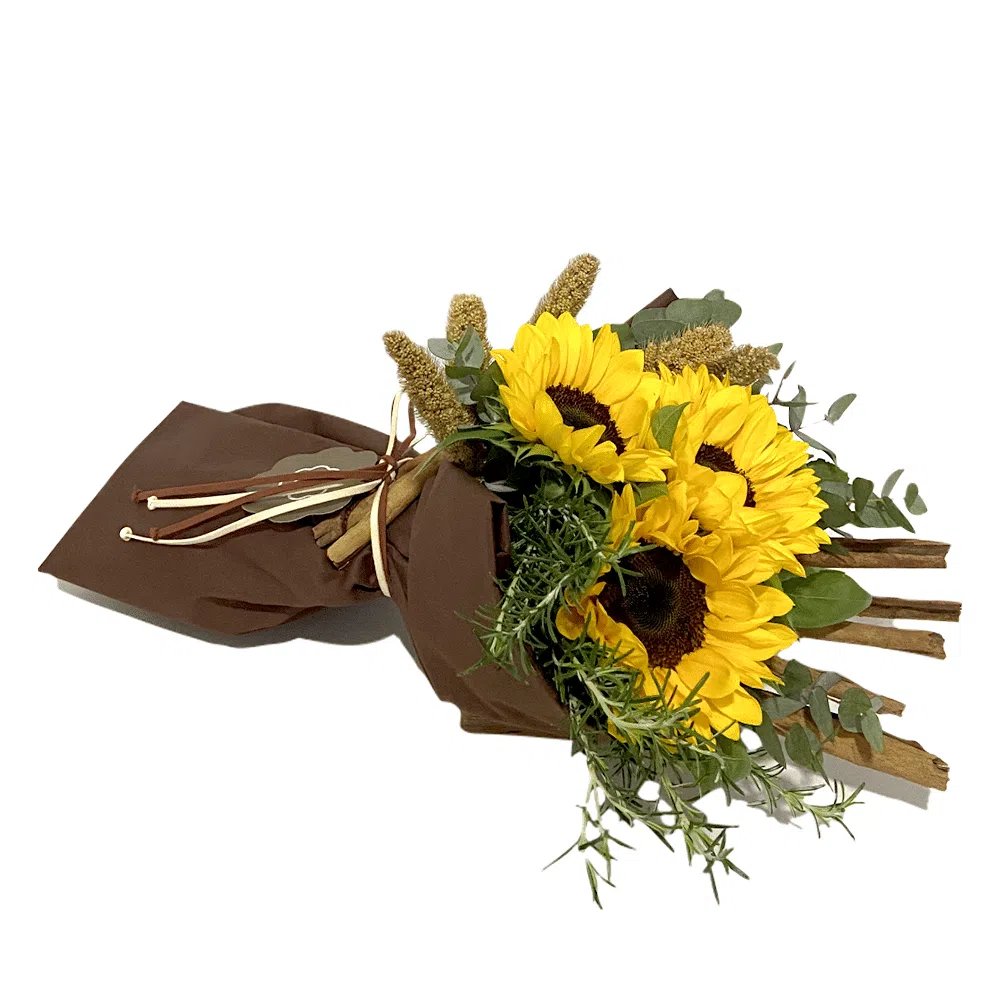 Alegre e radiante, o buquê “Trois Tournesol” composto por 03 Girassóis com detalhes de Alecrim e Canelas, desperta a felicidade dos momentos especiais.