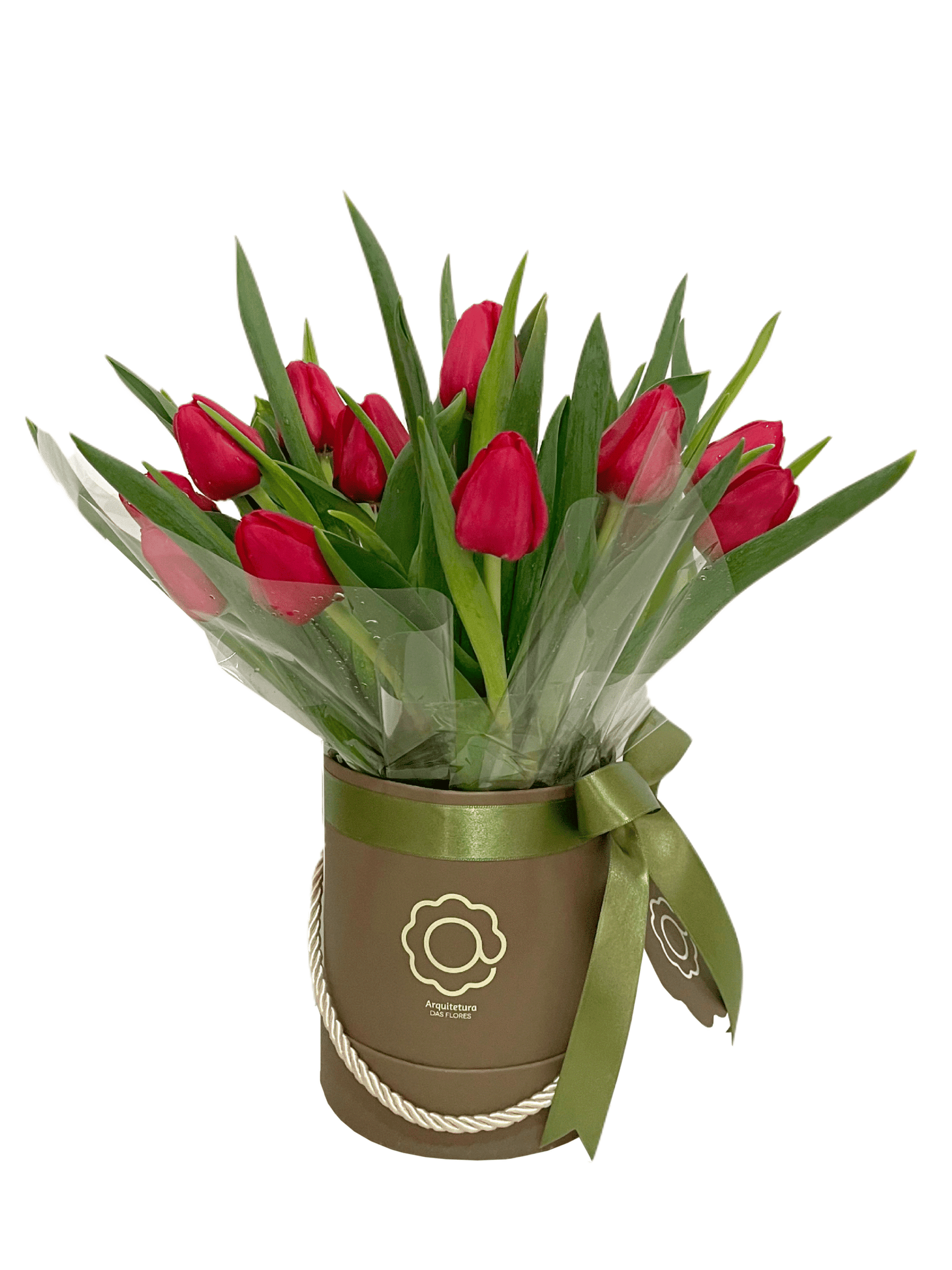 Adorável arranjo de 15 Tulipas vermelhas em box e laço de cetim, “Tulpen” é perfeito para presentear com carinho.