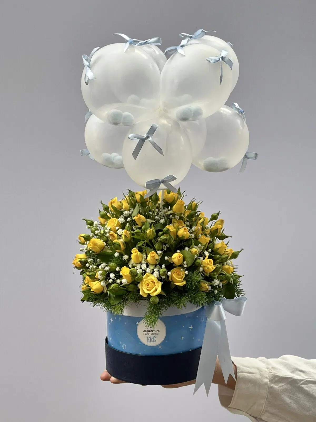Adorável box exclusiva de flores de Mini Rosas amarelas e mini balões, especialmente para presentear com muito carinho seu bebê e sua mamãe.