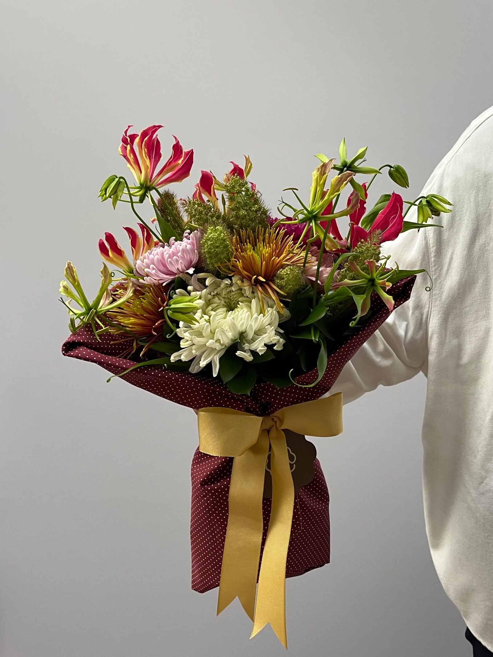 Buquê de anastasias, gloriosas e trigo aiwa envolto em tecido de algodão e fita de gorgorão dourado.