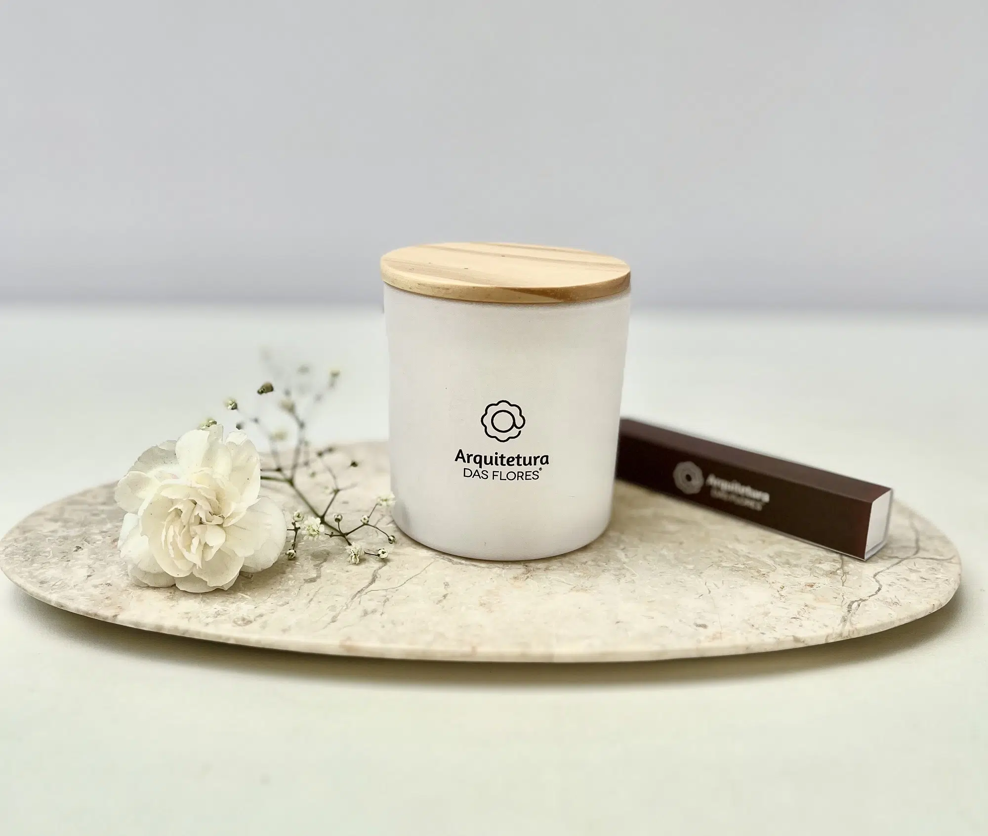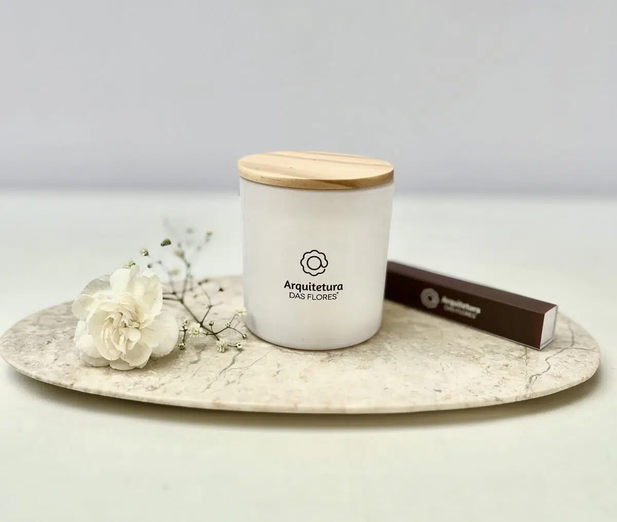 1 Vela exclusiva da Arquitetura das Flores 140g, feita com Cera cremosa vegetal.