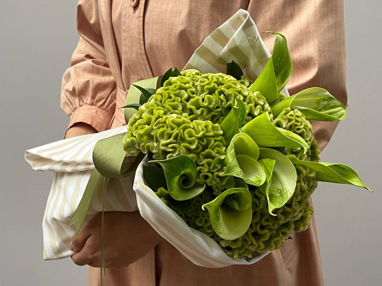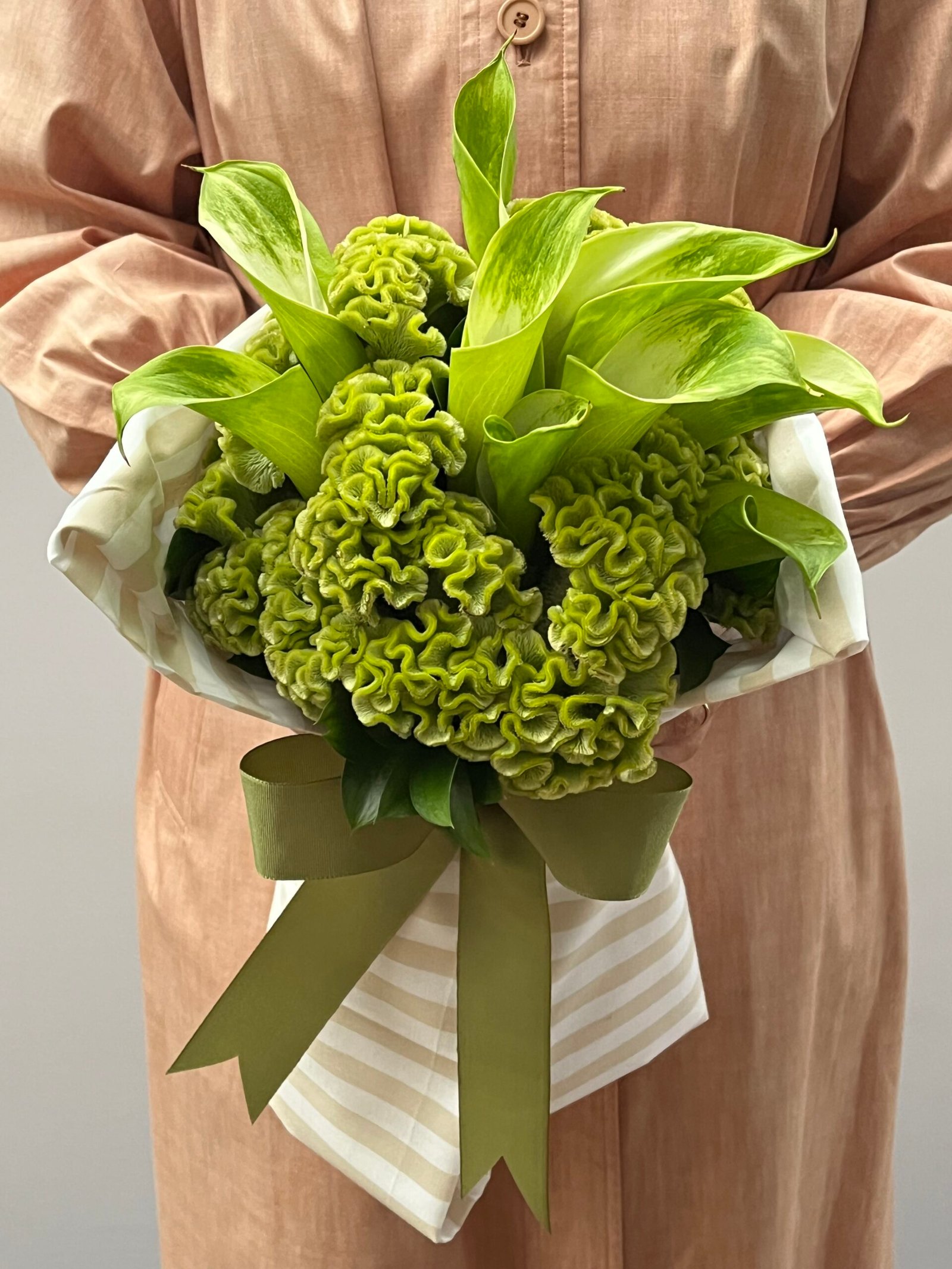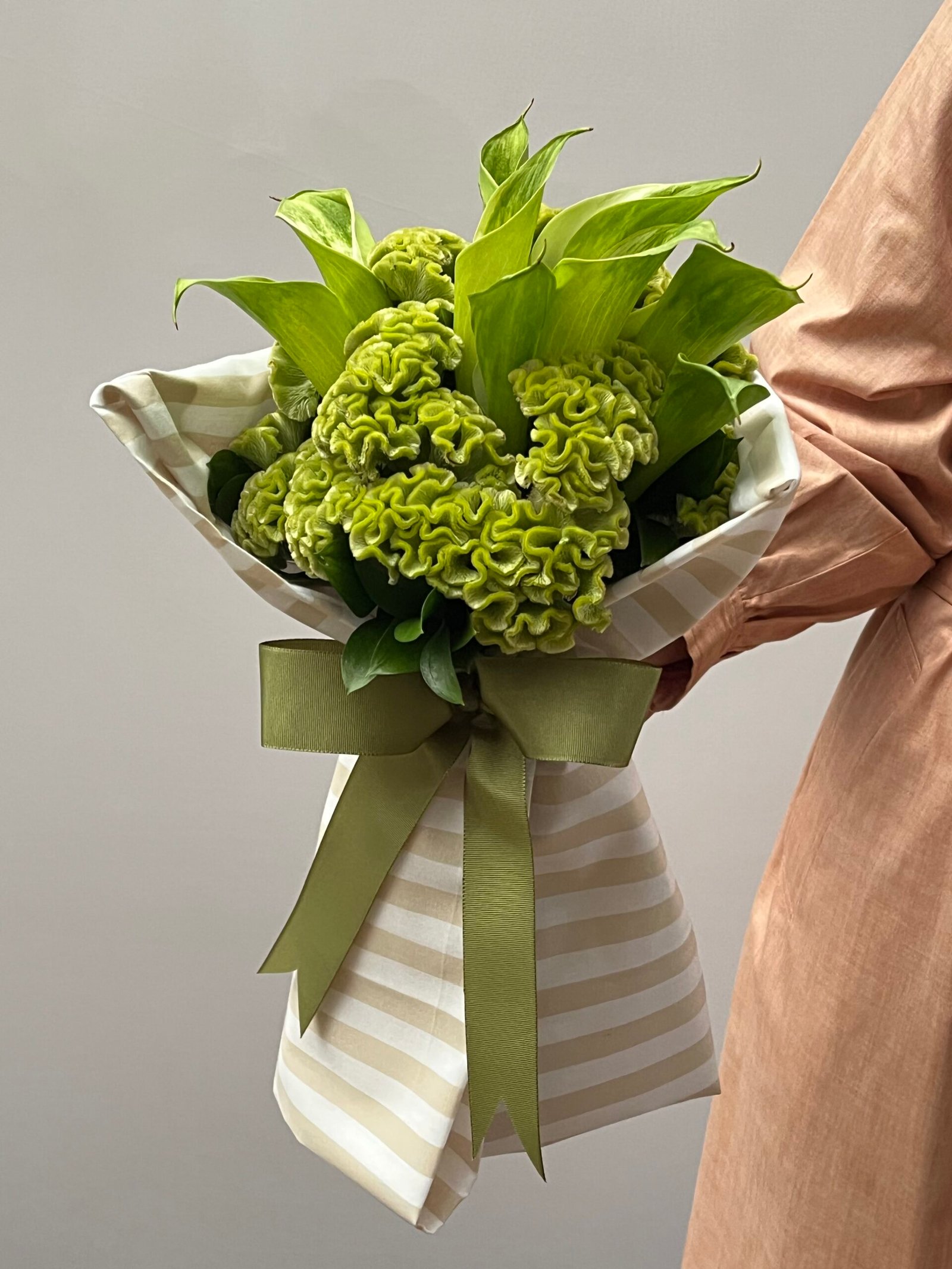 Buquê de callas, celósias e folhas de ruscus, envolto em tecido de algodão listrado branco e bege e finalizado com fita de gorgorão verde oliva.