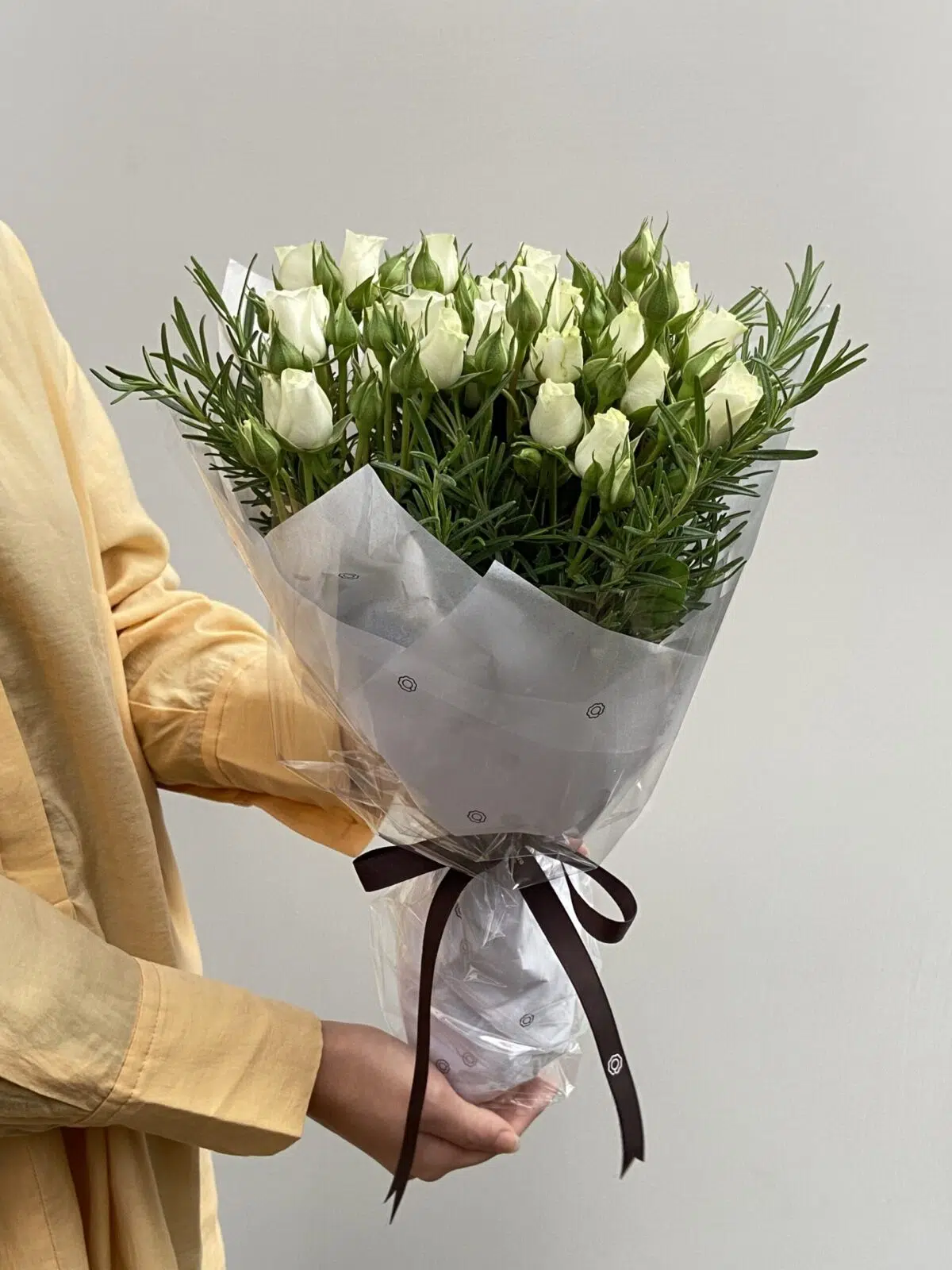 Buquê Mini Rosas Brancas envolto com papel seda e laço.