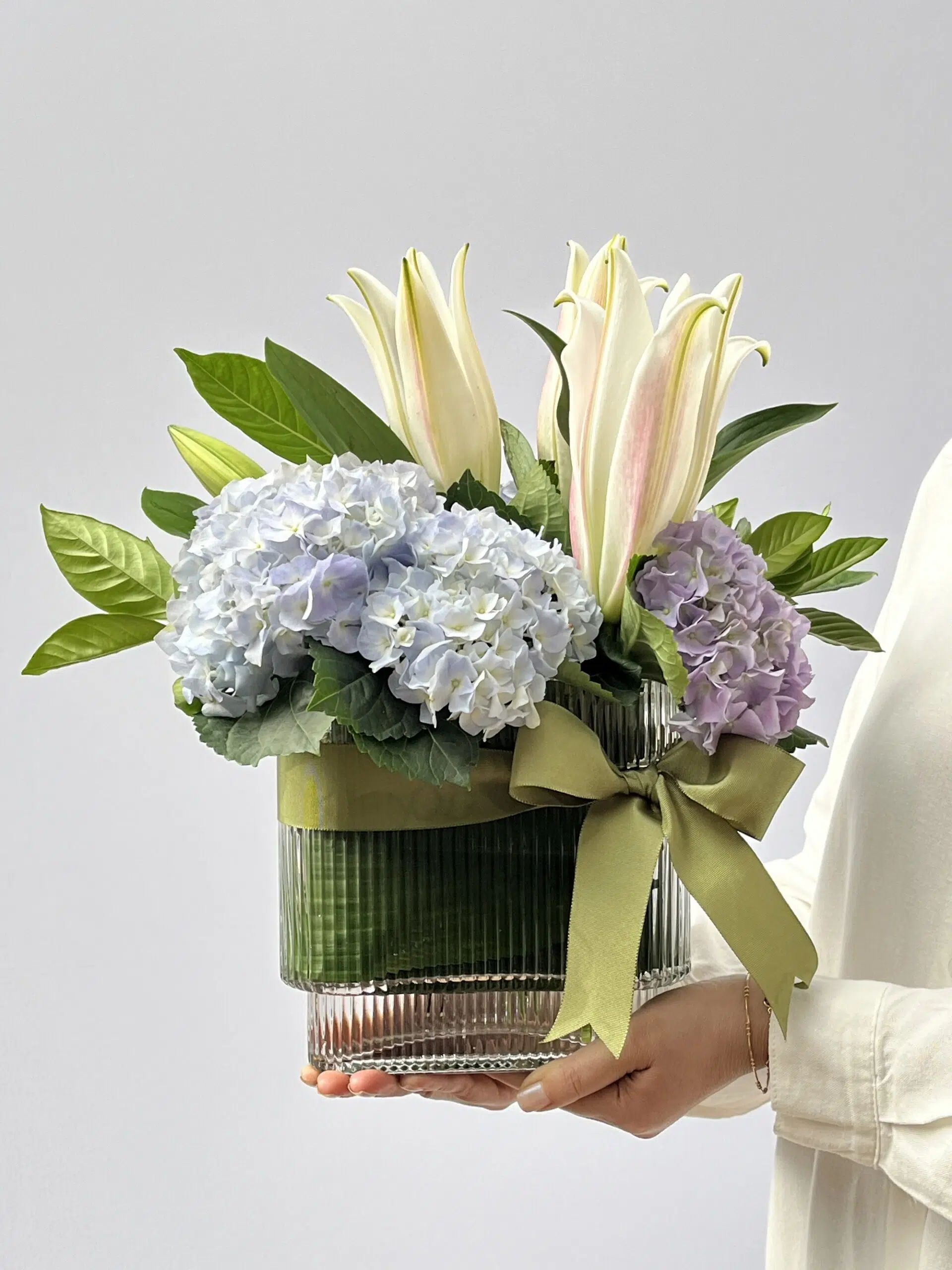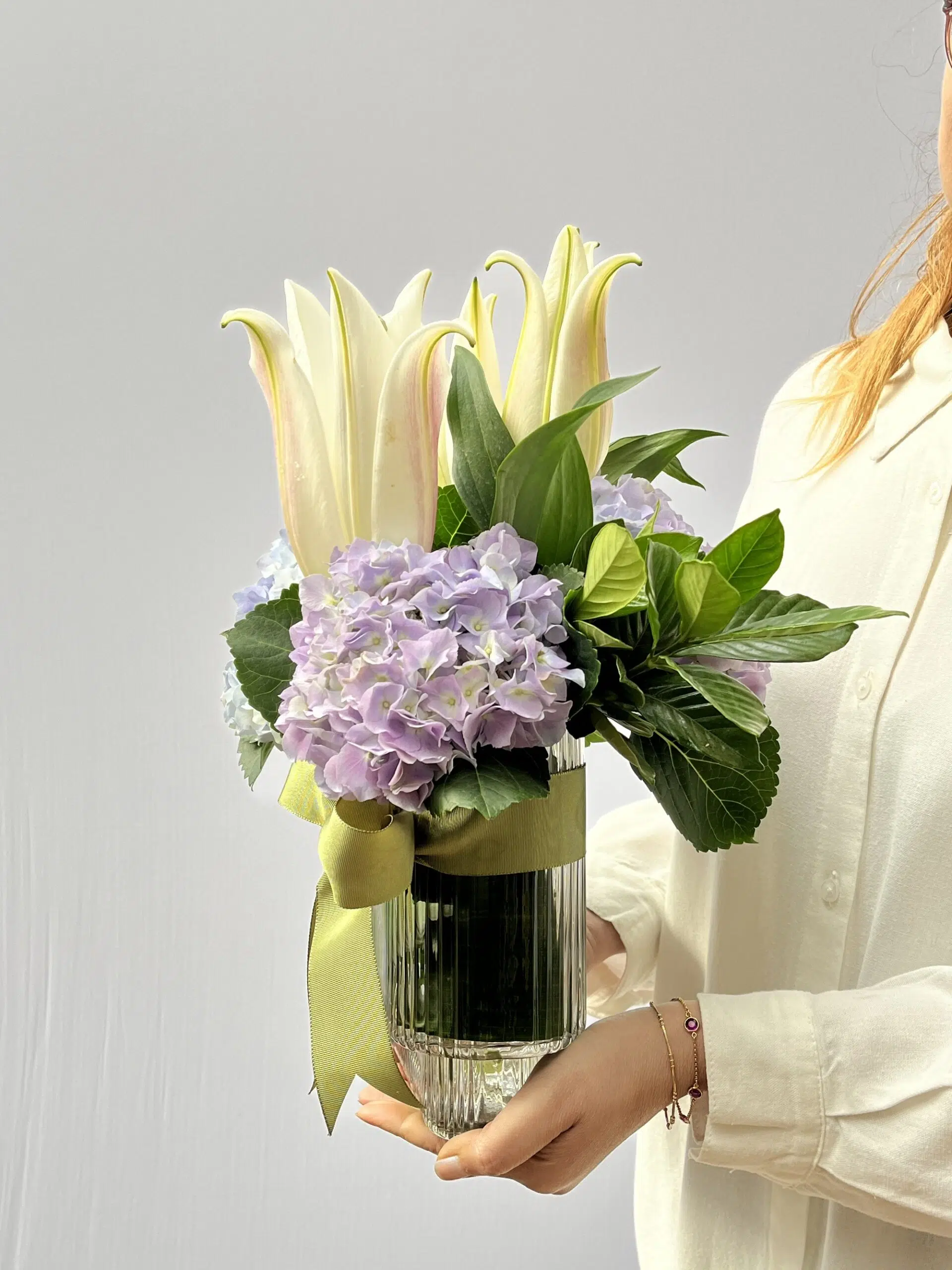 Um belo arranjo com as mais lindas flores de Hortênsias e Lírios em vaso de vidro, presentear em datas especiais ou decorar seu ambiente, sempre a escolha perfeita.