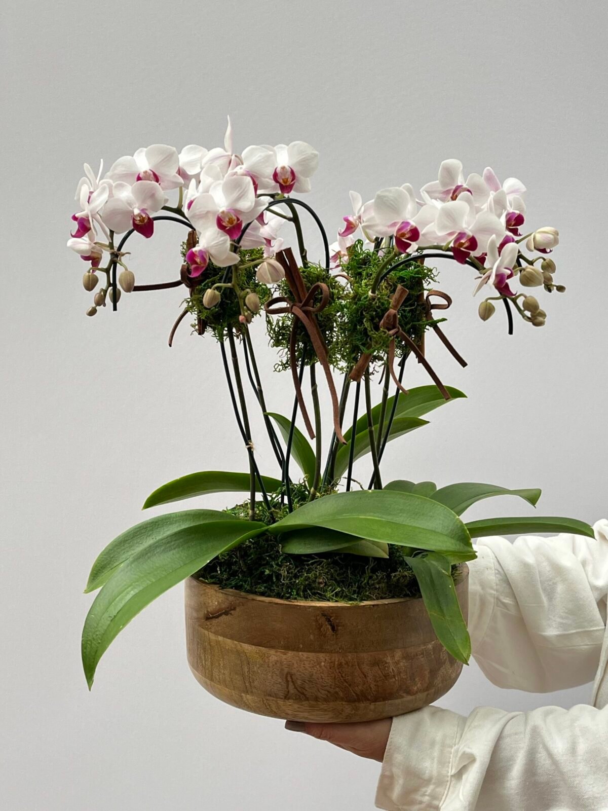 Uma coletânea de mini orquídeas plantadas com 06 hastes em cachepô de madeira importado. Perfeito para presentear e decorar seu ambiente.