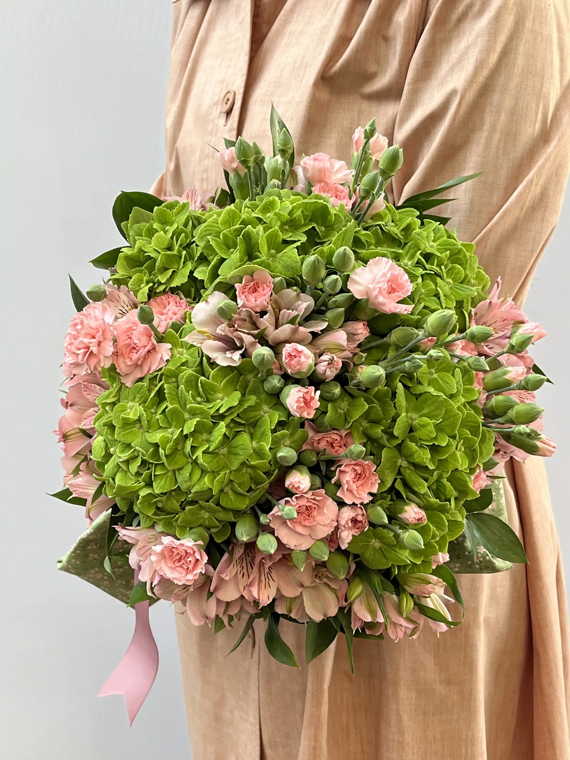 Hortênsias, cravinas, astromelias, ruscus, tecido e laço de gorgorão.