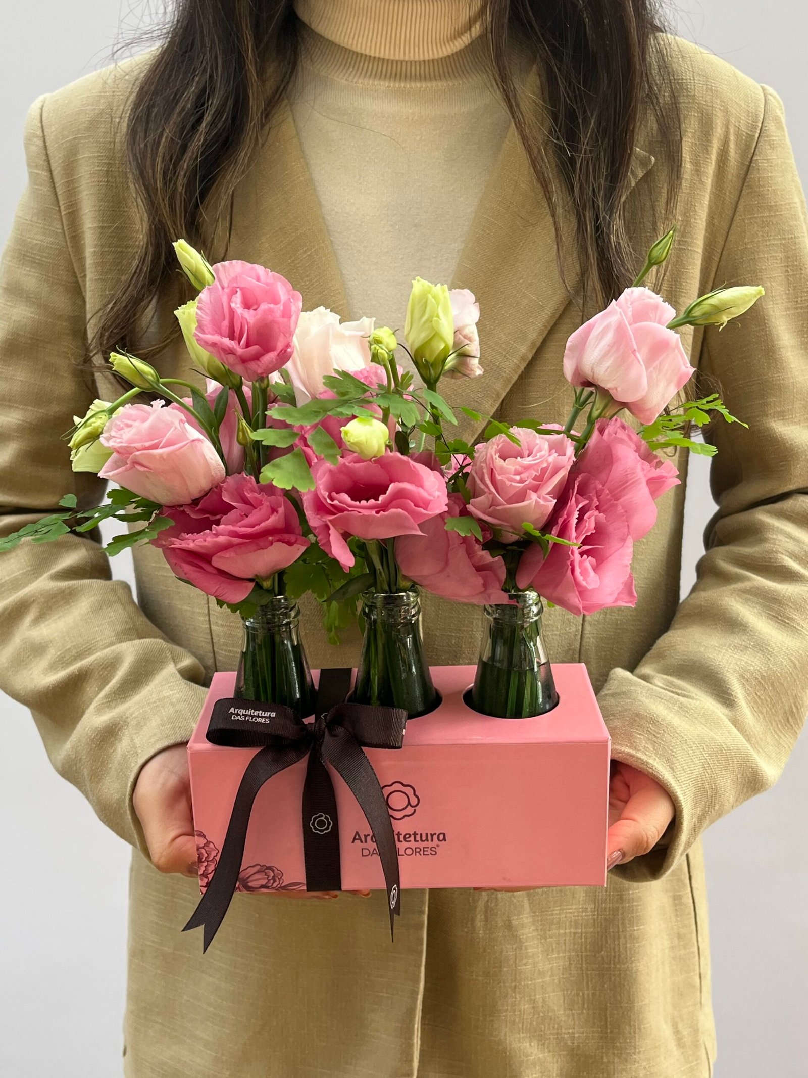 Uma box composta por Lisianthus acomodados em delicados frascos de vidro.